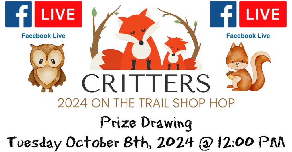 On the Trail Shop Hop will be going live on Tuesday October 8th 2024 @ 12:00 PM for the Super Grand Prize and Grand Prize Drawing. Watch the live on the Facebook page of On the Trails Shop Hop.